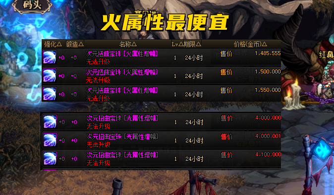 虽然也有职业自带火属性属性,但相对来说,没有那么热门。因此现在打开拍卖行发现,“火属性”是4种属性中最便宜的,且远远低于其他属性。