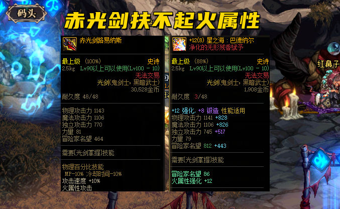 2、火属性没有强势装备加持!冰属性之所以强大,多多少少受了冰柱的影响;暗属性之所以强大,也是因为受了大幽魂的影响;光属性虽然没有门面武器,但很多热门职业、包括奶爸都会赋予光属性攻击;