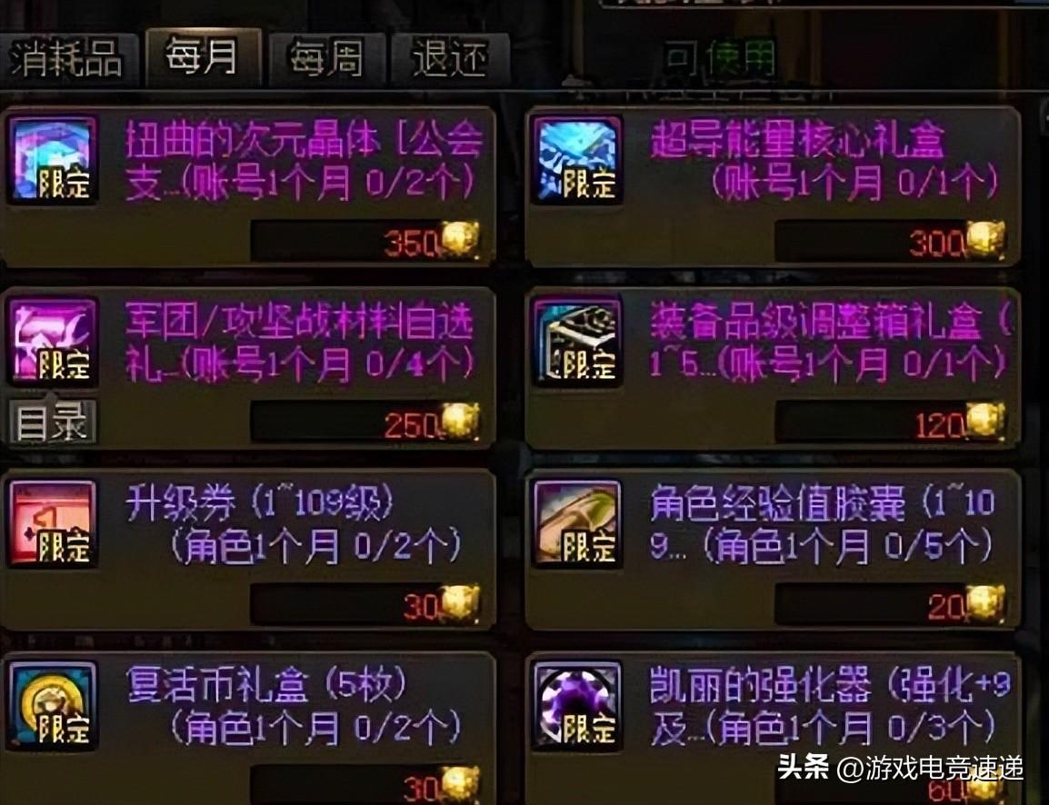 这些新的道具包括次元晶体、超导能量核心礼盒,军团/团本材料自选礼盒,增幅器,猫头鹰。其实韩服之前就爆料过了,相比韩服,国服还保留了增幅药剂和强化药剂,这是国服增幅主播必备的道具,策划为了引导氪金自然是不会删除的,这些道具将帮助玩家们在游戏中更好地进行战斗和挑战,提升他们在地下城的实力。