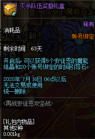礼盒打开后可以获得5个安徒恩的魔能结晶和20个帐号绑定的时间引导石。